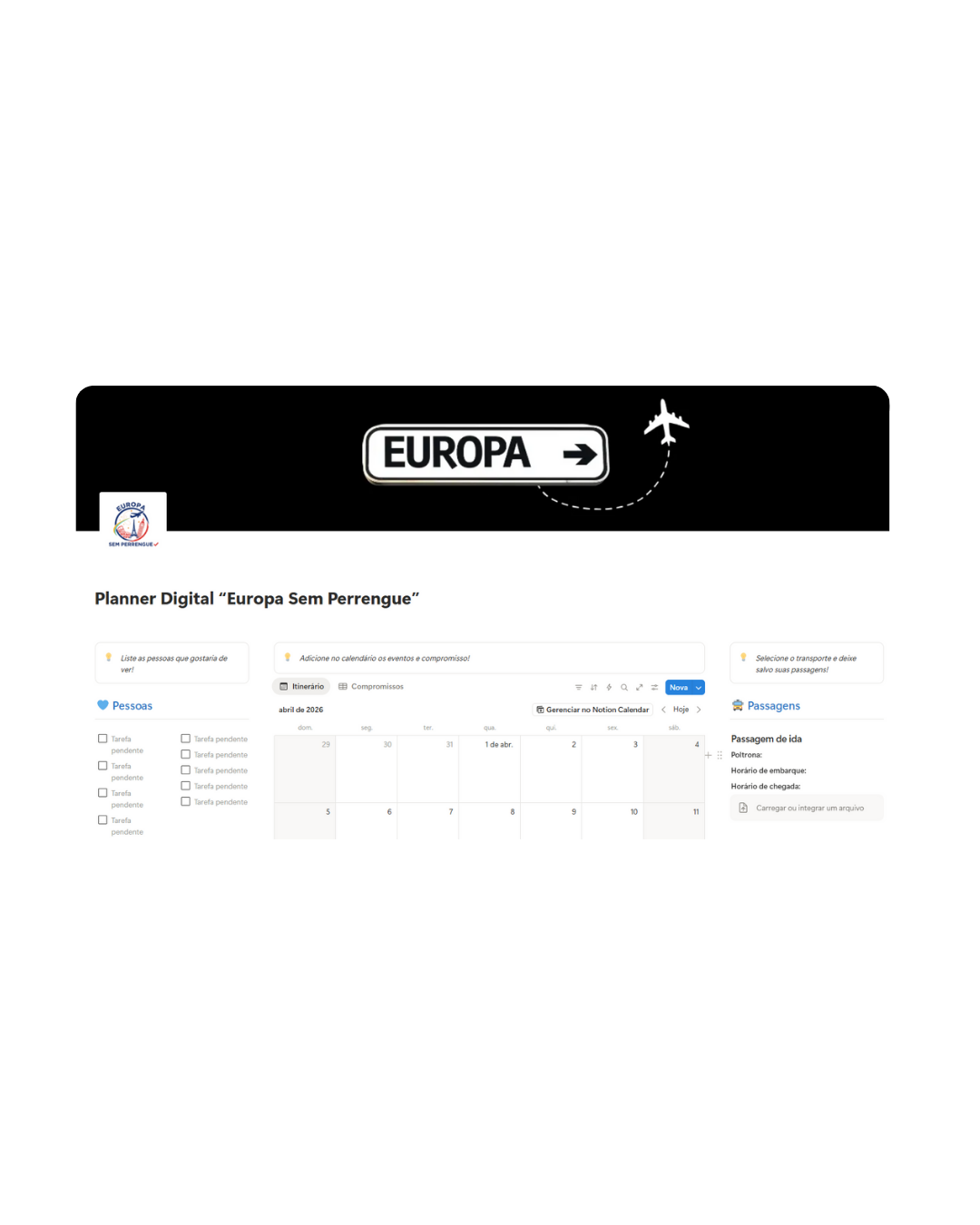 Esse planner é como um copiloto digital te guiando em cada etapa da sua jornada: antes, durante e depois da viagem.